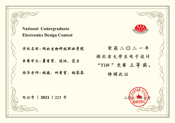 2021年5月至6月参加第十二届蓝桥杯全国软件和信息技术专业人才大赛“单片机设计与开发”、“JAVA软件开发”两个赛项获得国赛三等奖1个,省赛一等奖1个,省赛二等奖13个,省赛三等奖11个。