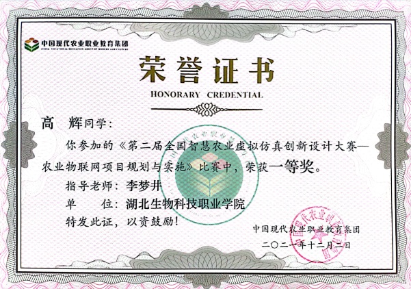 2021年12月参加中国现代农业职业教育集团举办的第二届全国智慧农业虚拟仿真创新设计大赛获一等奖1个,二等奖2个,三等奖3个。