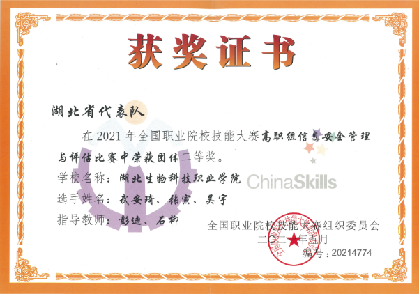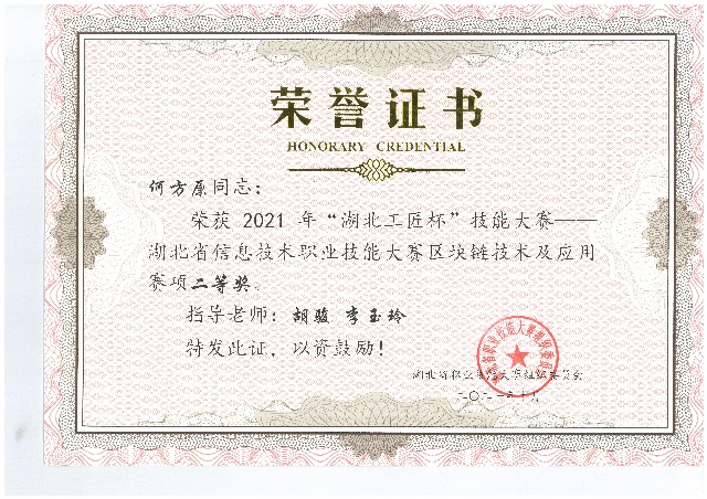 2021年10月至12月参加“湖北工匠杯”商务软件解决方案、移动应用开发、区块链技术、网络安全技术、工业互联网技术、测土施肥信息技术、5G+MR资源开发、信息通信信息化系统管理员等八个赛项获得一等奖8个,二等奖13个,三等奖9个。其中,何方原、柯希望两位教师及学生叶志浩,根据“湖北工匠杯”奖励办法,在报批湖北省人力资源和社会保障厅后将获得“湖北省技术能手”称号。