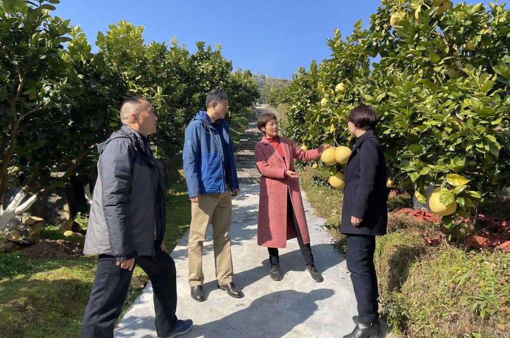 驻村工作队队长王红斌、队员涂爱萍向曾开红介绍贡水白柚的种植情况