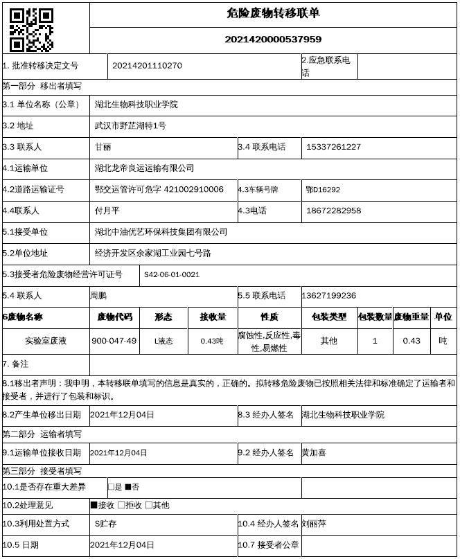 根据《中华人民共和国固体废物污染环境防治法》和相关环保法律的规定,我校于2021年12月4日完成了学校实验室危险废物转运处置工作,现将具体情况公告如下: