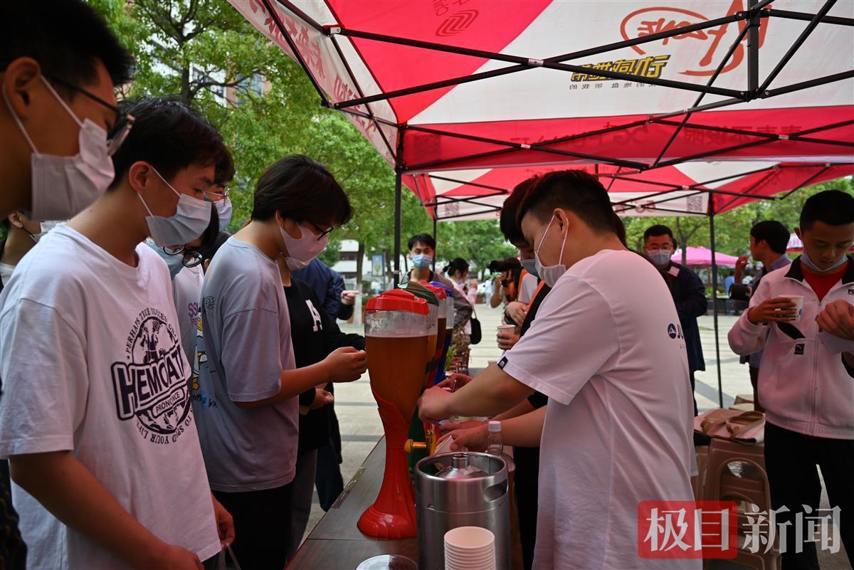 醇香的啤酒吸引了众多师生前来品尝。“今天展示的啤酒种类有IPA、小麦、大麦、黑啤。制作过程中不添加任何的辅助材料,使用纯麦芽发酵。”20级生物工程学院制药1班邱蔚在介绍精酿啤酒的种类和制作工艺时说道。