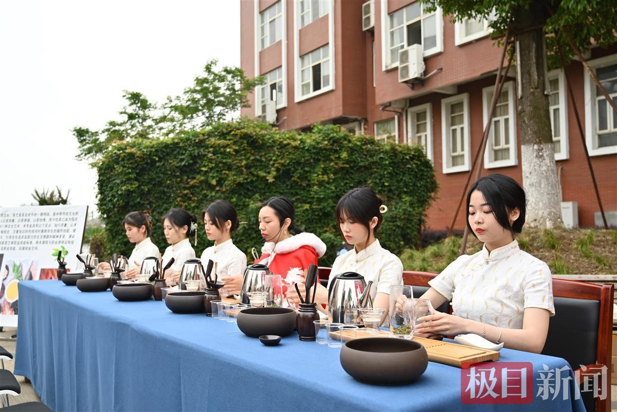 在茶艺展示摊位前,该校几位女生齐坐一排,拿着茶具为观众们做着展示。“入口第一感觉有点涩,而后逐渐很润。茶的颜色好看清澈,茶香很浓。”现场一名女生在品茶后说道。