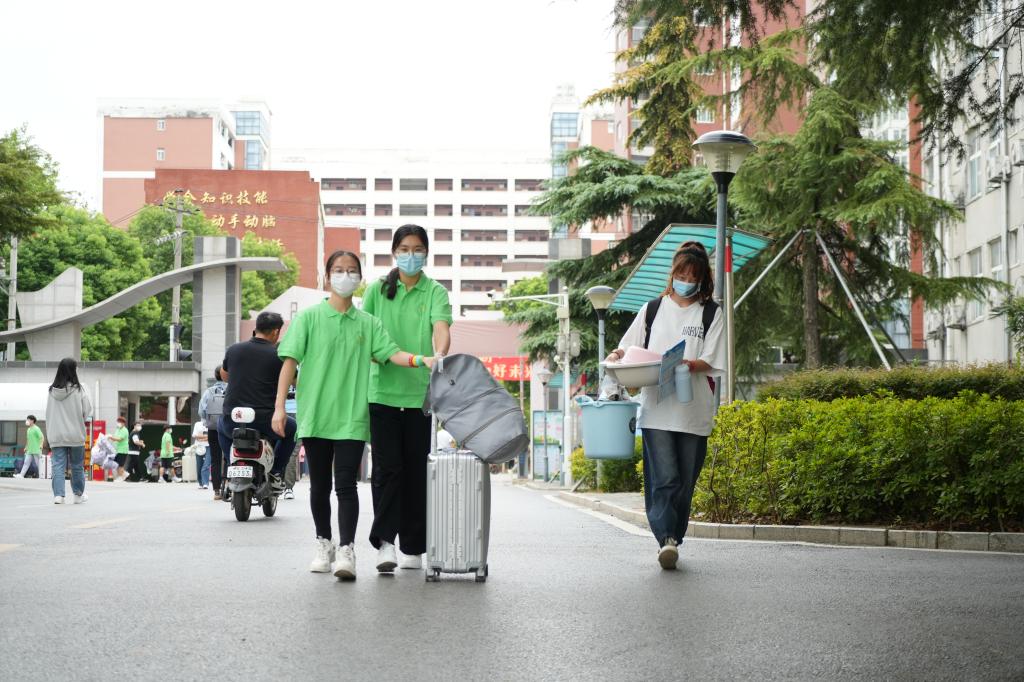 “今年受疫情影响新生家长们不能进校,所以新生到达后需要有人帮忙搬运行李,引导他们去完成入学报到手续。”一位在校门口值守的学生志愿者说道。