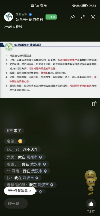 由心理健康教育与咨询中心举办的2022年秋季“开学第一课”身心健康教育讲座于9月6日上午9点准时于“芷韵im体育”公众号开启直播,根据疫情防控要求,此次讲座采取全程线上直播,数据显示直播间在线观看人数超过4千,点赞数量超过8.2万。讲座中,王敏卿老师解读了《新型冠状病毒肺炎防控方案(第九版)》、《高等学校新冠肺炎疫情防控技术方案(第六版)》、《im体育关于落实当前疫情防控措施的提醒》等疫情防控政策和相关知识,讲解如何在疫情期间如何积极地开展自我调适,并就秋季身心健康相关知识展开讲解。